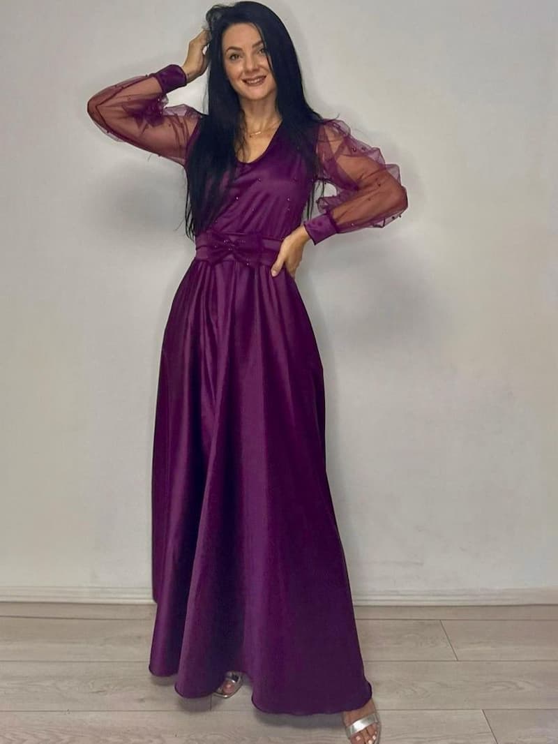 Rochia elegantă lungă Eda este perfectă pentru orice eveniment. Este din tafta și tull cu perle. Linia decolteului este rotundă, iar mânecile sunt lungi, cu manșeta și usor bufante. Fusta este în cloş, are buzunare şi are elastic în talie. Cordonul este inclus. Lungimea totala a rochiei este de aproximativ 1.5 m. Culori disponibile: negru, albastru, grena, roz, verde, mov.